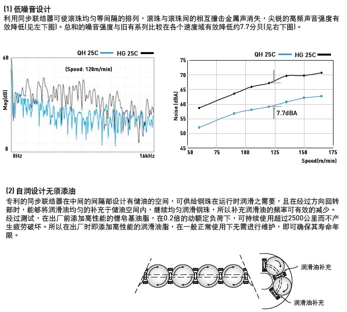 上银静音系列导轨的球联接器间隔部设计可使滚珠与滚珠之问的相互摩擦消失,且上银导轨的专利设计使得 滚珠与球联接器之问為环形线接触,可减少两者问的接触面积,进而有效降低摩擦阻力,使得 Q1 Type 系列 具有卓越的高速性能! 台湾上银导轨静音系列导轨的使用范围: